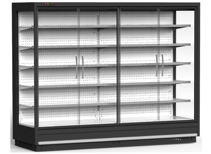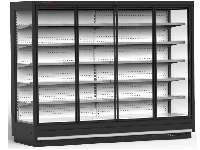 Süt ve süt ürünlerinin muhafazası için dikey sütlük dolapları. Cam kapaklar sayesinde ürün görünürlüğü maksimize edilir.